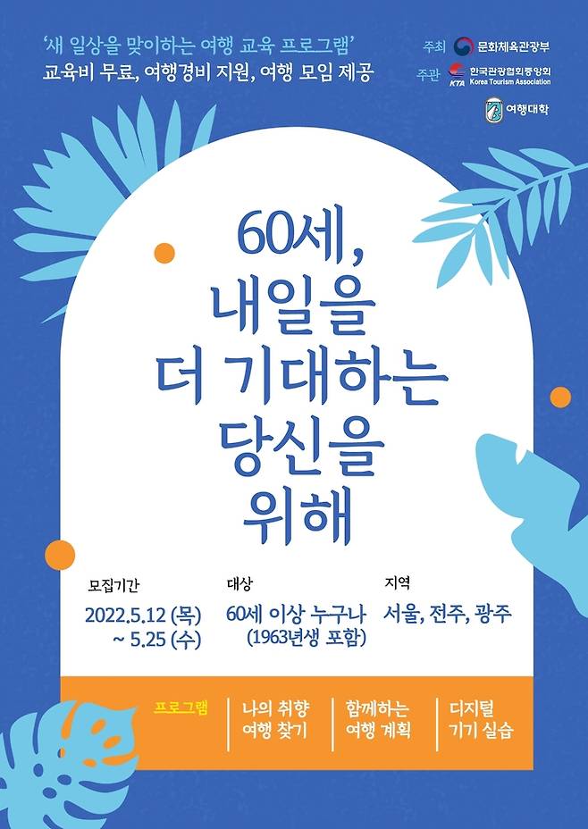 오는 25일까지 시니어 꿈꾸는 여행자 홈페이지에서 60세 이상(1963년생 포함)이면 누구나 지원 가능하다. 합격자는 이달 31일 홈페이지를 통해 발표할 예정이다. 개강일은 광주 6월 8일, 전주 9일, 서울 10일 순이다.