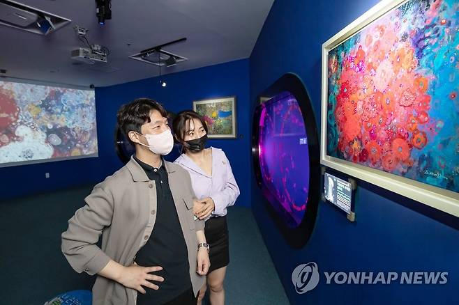 (서울=연합뉴스) 롯데월드가 오는 8월 15일까지 롯데월드 아쿠아리움과 롯데월드타워 전망대 서울스카이에서 산호 작가 서경희의 'Sea-stories' 초대전을 진행한다고 15일 밝혔다. 사진은 아쿠아리움에서 전시를 감상하는 관람객들. 2022.5.15 [롯데월드 제공. 재판매 및 DB 금지]