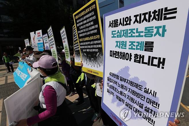 (서울=연합뉴스) 신현우 수습기자 = 전태일재단, 도심제조연대 등 관계자들이 15일 오전 서울 중구 청계광장에서 도심제조노동자 공동요구안을 발표하고 있다.