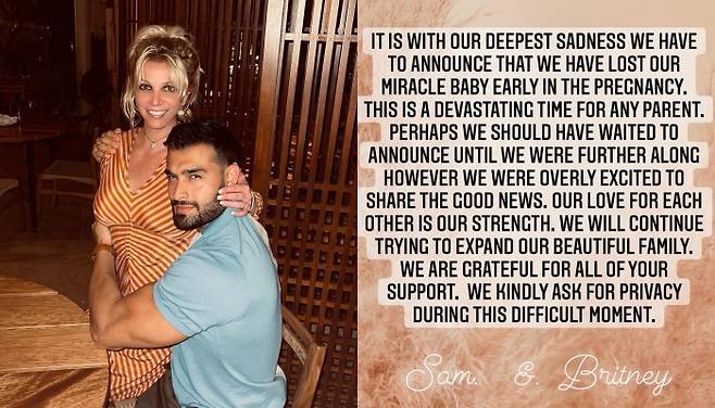 스피어스는 오늘(15일) 자신의 인스타그램에 약혼자인 샘 아스가리와 공동 명의로 올린 글을 통해 "기적의 아기를 임신 초기에 잃었다. 이 사실을 발표해야해 매우 슬프다. 지금은 어떤 부모에게도 비통한 시간"이라고 말했다.