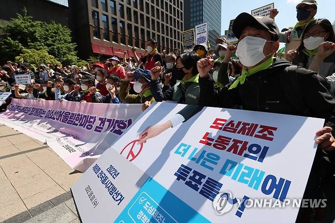 이들은 6·1 지방선거 출마 후보들에게 도심제조노동자 권리보장을 위한 정책협약 체결, 도심제조노동자 지원조례 제정 등을 제안했다. 2022.5.15