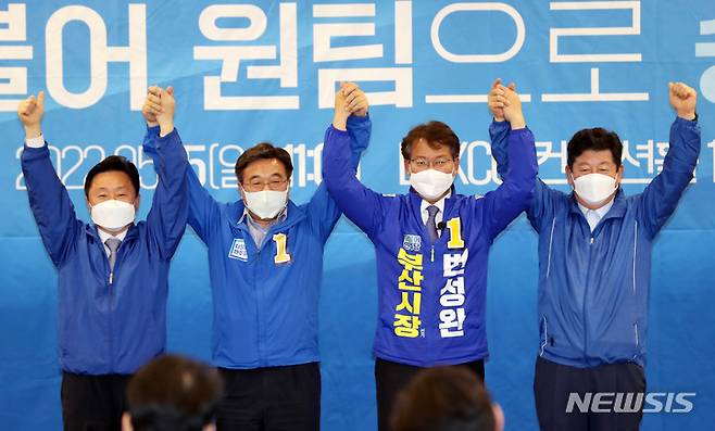 [부산=뉴시스] 하경민 기자 = 윤호중 더불어민주당 비상대책위원장이 15일 오전 부산 해운대구 벡스코 컨벤션홀에서 열린 더불어민주당 부산시당 6·1지방선거 후보자 전원회의에 참석, 변성완 부산시장 후보 등과 손을 들고 인사하고 있다. 2022.05.15. yulnetphoto@newsis.com
