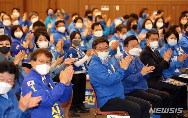 [부산=뉴시스] 하경민 기자 = 윤호중 더불어민주당 비상대책위원장이 15일 오전 부산 해운대구 벡스코 컨벤션홀에서 열린 더불어민주당 부산시당 6·1지방선거 후보자 전원회의에 참석, 변성완 부산시장 후보 등 공천을 받은 후보자들과 행사진행을 지켜보고 있다. 2022.05.15. yulnetphoto@newsis.com