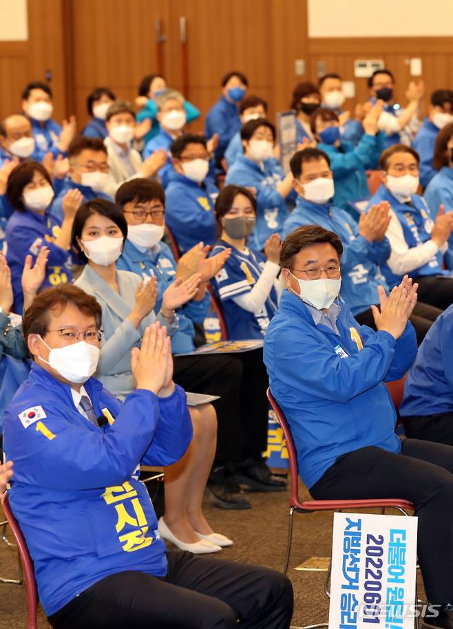 [부산=뉴시스] 하경민 기자 = 윤호중 더불어민주당 비상대책위원장이 15일 오전 부산 해운대구 벡스코 컨벤션홀에서 열린 더불어민주당 부산시당 6·1지방선거 후보자 전원회의에 참석, 변성완 부산시장 후보 등 공천을 받은 후보자들과 행사진행을 지켜보고 있다. 2022.05.15. yulnetphoto@newsis.com