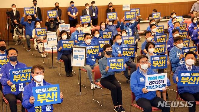 [부산=뉴시스] 하경민 기자 = 윤호중 더불어민주당 비상대책위원장이 15일 오전 부산 해운대구 벡스코 컨벤션홀에서 열린 더불어민주당 부산시당 6·1지방선거 후보자 전원회의에 참석, 변성완 부산시장 후보 등 공천을 받은 후보자들과 손팻말을 들고 필승 구호를 외치고 있다. 2022.05.15. yulnetphoto@newsis.com
