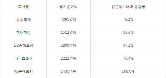 또 다른 주요 손보사인 KB손해보험은 KB금융지주 기업설명회에서 실적을 발표했는데 지난해보다 108.0% 증가한 1431억원을 벌었다고 밝혔다. 주요 5개사의 실적을 합하면 순이익이 1조2056억원에 달한다. 5대 손보사의 분기 순이익이 1조원을 넘어선 건 처음이다.