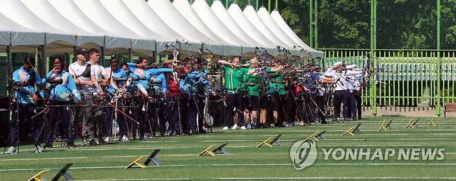 (광주=연합뉴스) 박철홍 기자 = 15일 오전 광주 서구 월드컵경기장 축구센터(옛 서향순 양궁장)에서 광주 양궁 월드컵 출전 선수들이 연습하고 있다. 2022.5.15
