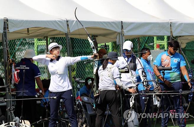 (광주=연합뉴스) 박철홍 기자 = 15일 오전 광주 서구 월드컵경기장 축구센터(옛 서향순 양궁장)에서 광주 양궁 월드컵 출전하는 국가대표 안산이 연습하고 있다. 2022.5.15