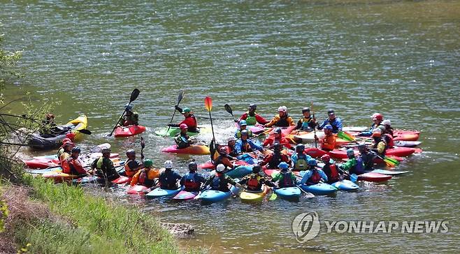 (인제=연합뉴스) 15일 강원 인제군 내린천에서 카약동호인들이 카약을 즐기고 있다. 2022.5.15 [인제군 제공. 재판매 및 DB 금지]