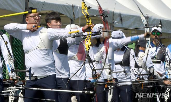 [광주=뉴시스] 류형근 기자 = 광주2022현대양궁월드컵 개막이 이틀 앞으로 다가온 15일 오전 광주 서구 염주종합체육관 축구센터에 마련된 양궁연습장에서 국가대표 선수들이 공개 훈련을 하고 있다. 광주양궁월드컵은 17일부터 22일까지 광주국제양궁장과 광주여자대학교에서 펼쳐진다. 2022.05.15. hgryu77@newsis.com