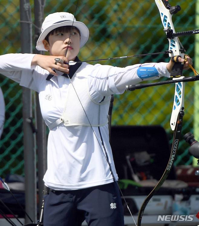 [광주=뉴시스] 류형근 기자 = 광주2022현대양궁월드컵 개막이 이틀 앞으로 다가온 15일 오전 광주 서구 염주종합체육관 축구센터에 마련된 양궁연습장에서 국가대표 안산(광주여대)이 공개 훈련을 하고 있다. 광주양궁월드컵은 17일부터 22일까지 광주국제양궁장과 광주여자대학교에서 펼쳐진다. 2022.05.15. hgryu77@newsis.com