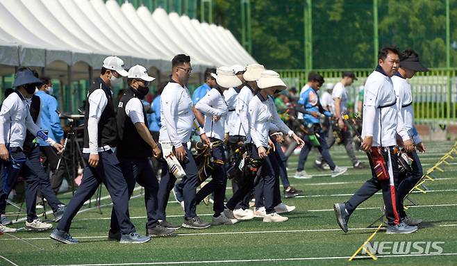 [광주=뉴시스] 류형근 기자 = 광주2022현대양궁월드컵 개막이 이틀 앞으로 다가온 15일 오전 광주 서구 염주종합체육관 축구센터에 마련된 양궁연습장에서 남자 국가대표 선수들이 과녁 확인을 위해 이동하고 있다. 광주양궁월드컵은 17일부터 22일까지 광주국제양궁장과 광주여자대학교에서 펼쳐진다. 2022.05.15. hgryu77@newsis.com