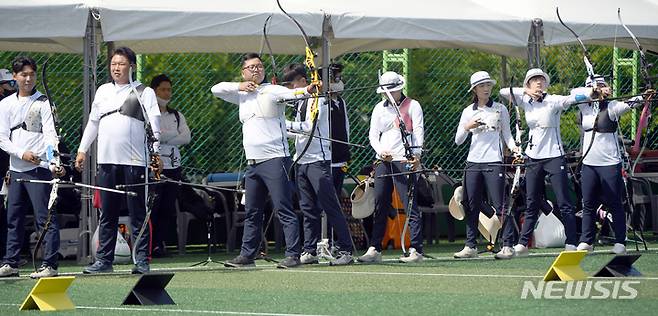 [광주=뉴시스] 류형근 기자 = 광주2022현대양궁월드컵 개막이 이틀 앞으로 다가온 15일 오전 광주 서구 염주종합체육관 축구센터에 마련된 양궁연습장에서 국가대표 선수들이 공개 훈련을 하고 있다. 광주양궁월드컵은 17일부터 22일까지 광주국제양궁장과 광주여자대학교에서 펼쳐진다. 2022.05.15. hgryu77@newsis.com