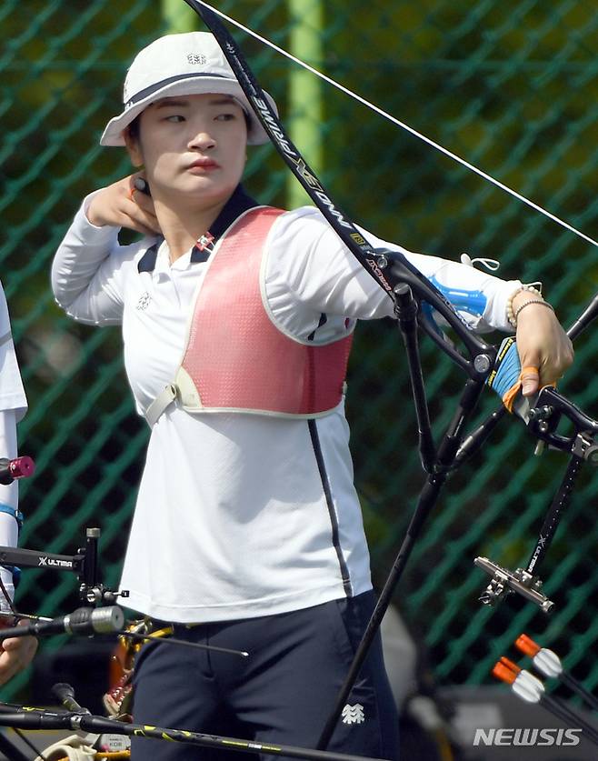 [광주=뉴시스] 류형근 기자 = 광주2022현대양궁월드컵 개막이 이틀 앞으로 다가온 15일 오전 광주 서구 염주종합체육관 축구센터에 마련된 양궁연습장에서 국가대표 강채영(현대모비스)이 공개 훈련을 하고 있다. 광주양궁월드컵은 17일부터 22일까지 광주국제양궁장과 광주여자대학교에서 펼쳐진다. 2022.05.15. hgryu77@newsis.com