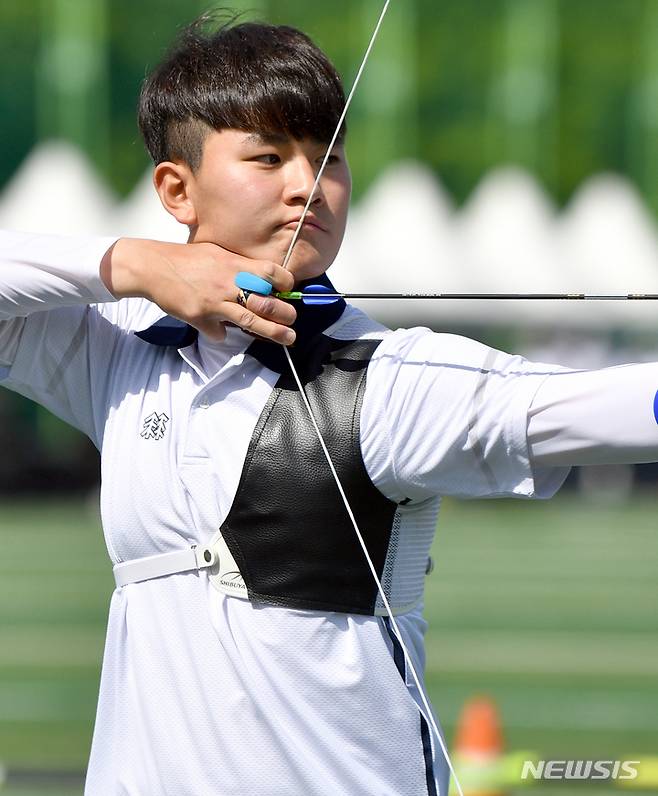 [광주=뉴시스] 류형근 기자 = 광주2022현대양궁월드컵 개막이 이틀 앞으로 다가온 15일 오전 광주 서구 염주종합체육관 축구센터에 마련된 양궁연습장에서 국가대표 김제덕(경북일고)이 공개 훈련을 하고 있다. 광주양궁월드컵은 17일부터 22일까지 광주국제양궁장과 광주여자대학교에서 펼쳐진다. 2022.05.15. hgryu77@newsis.com