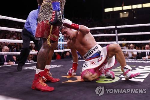 epa09947938 Brian Castano of Argentina (R) is knocked out the first time by Jermell Charlo of the US (L), during their 12 round Undisputed Super Welterweight Championship fight at the Dignity Health Sports Park in Carson, California, USA, 14 May 2022. EPA/ETIENNE LAURENT