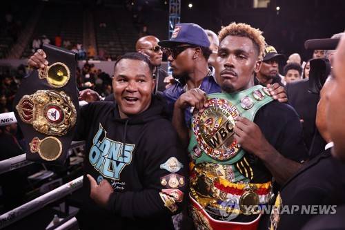 epa09947944 Jermell Charloof (R) of the US, celebrates his victory against Brian Castano of Argentina, during their 12 round Undisputed Super Welterweight Championship fight at the Dignity Health Sports Park in Carson, California, USA, 14 May 2022. EPA/ETIENNE LAURENT