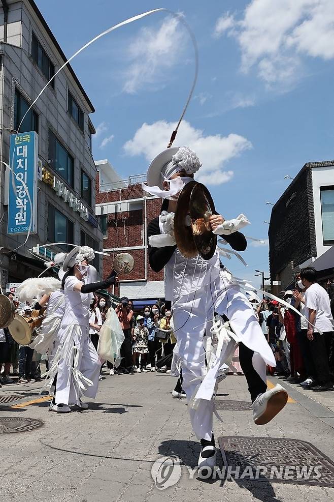 섣달그믐날 궁중, 관아, 민간에서 가면을 쓴 사람들이 귀신을 몰아내던 전통의례인 나례를 현대적으로 재해석한 이번 행사는 코로나19로 침체한 골목상권에 복을 전한다는 의미로 펼쳐졌다. 2022.5.15