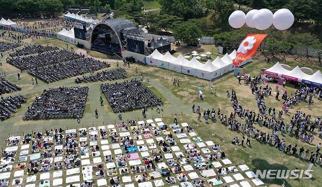 [서울=뉴시스] 백동현 기자 = 맑은 날씨를 보인 15일 오후 서울 송파구 올림픽공원 88잔디마당에서 열린 '뷰티풀 민트 라이프 2022'를 찾은 시민들이 축제를 즐기고 있다. 2022.05.15. livertrent@newsis.com