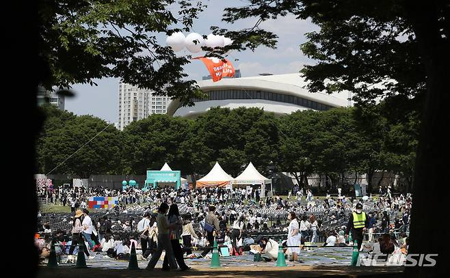 [서울=뉴시스] 백동현 기자 = 맑은 날씨를 보인 15일 오후 서울 송파구 올림픽공원 88잔디마당에서 열린 '뷰티풀 민트 라이프 2022'를 찾은 시민들이 축제를 즐기고 있다. 2022.05.15. livertrent@newsis.com