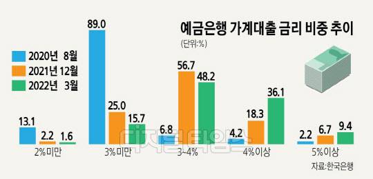 3∼4% 사이의 대출금리가 48.2%로 절반 수준에 달했지만, 3% 미만 금리 비중은 15.7%에 불과했다. 지난해 12월 기준 신규 대출의 3% 미만 비중이 25.0%였던 것을 감안하면 불과 3개월 사이에 대출금리의 하단과 상단이 급변했음을 알 수 있다. 같은 기간 5% 이상 금리의 가계대출 비율도 6.7%에서 9.4%로 높아졌다. 반대로 3% 미만 금리 비중은 작년 12월 25.0%에서 올 3월 15.7%까지 급감했다.