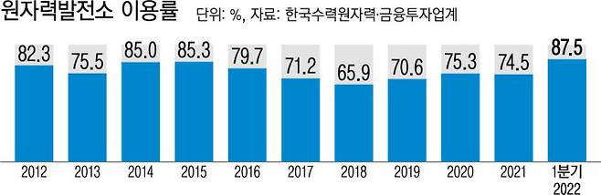 15일 한국수력원자력과 메리츠증권에 따르면 올해 1분기 국내 원전 이용률은 87.5%로 전년 동기 대비 6.7%포인트 늘었다. 지난 1분기 원전 이용률은 박근혜 정부 임기(2013∼2016년) 평균 원전 이용률 81.4%보다 높고, 이명박 정부(2008∼2012년) 당시 이용률인 90.0%보다는 소폭 낮다.