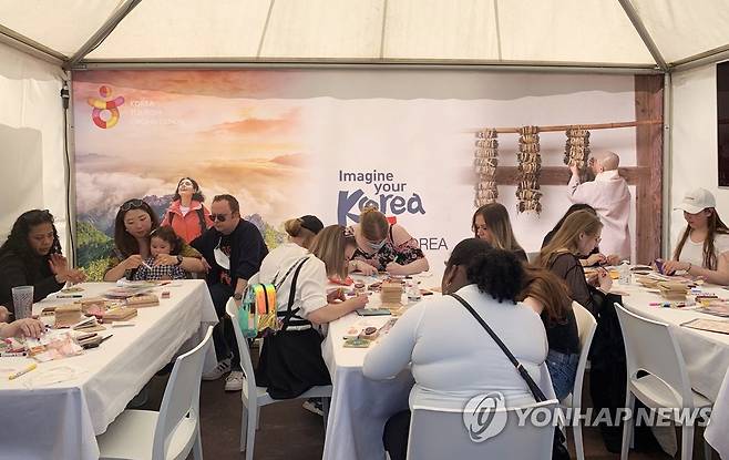 (서울=연합뉴스) 한국관광공사가 주프랑크푸르트총영사관과 함께 지난 14일부터 15일 이틀간 독일 프랑크푸르트 도이치방크 파크에서 한류 콘텐츠를 종합적으로 체험할 수 있는 '2022 코리아 페스티벌'을 개최한다고 밝혔다. 사진은 한국관광홍보관에서 공예 체험하는 방문객들 모습. 2022.5.15 [한국관광공사 제공. 재판매 및 DB 금지]