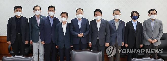 (서울=연합뉴스) 김인철 기자 = 추경호 경제부총리 겸 기획재정부 장관(왼쪽 다섯번째)이 15일 오후 서울 종로구 정부서울청사에서 열린 경제관계장관 간담회에서 장관들과 기념촬영을 하고 있다.