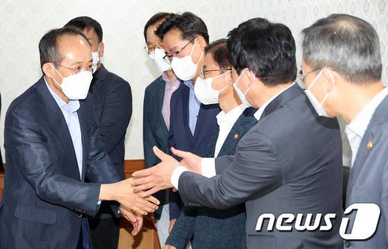 (서울=뉴스1) 박지혜 기자 = 추경호 경제부총리 겸 기획재정부 장관이 15일 오후 서울 종로구 정부서울청사에서 열린 경제관계장관회의에 앞서 참석한 장관들과 인사를 나누고 있다. 2022.5.15/뉴스1