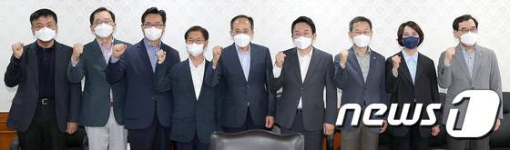 (서울=뉴스1) 박지혜 기자 = 15일 오후 서울 종로구 정부서울청사에서 열린 경제관계장관회의에 앞서 추경호 경제부총리 겸 기획재정부 장관을 비롯한 참석자들이 기념 촬영을 하고 있다. 왼쪽부터 최상목 대통령비서실 경제수석, 조승환 해양수산부 장관, 정황근 농림축산식품부 장관, 이정식 고용노동부 장관, 추경호 경재부총리 겸 기획재정부 장관, 원희룡 국토교통부 장관, 이종호 과학기술정보통신부 장관, 이영 중소벤처기업부 장관, 이창양 산업통상자원부 장관. 2022.5.15/뉴스1