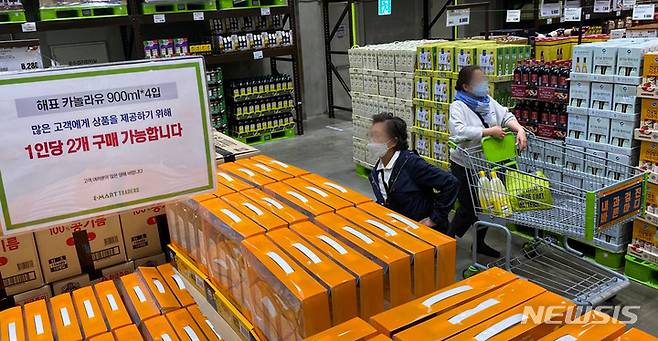 15일 오전 서울시내 창고형 대형마트에 구매 수량 제한 조치 안내문이 게시돼 있다.