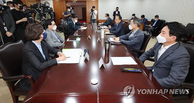 (서울=연합뉴스) 김인철 기자 = 추경호 경제부총리 겸 기획재정부 장관(오른쪽 세번째)이 15일 오후 서울 종로구 정부서울청사에서 열린 경제관계장관 간담회에서 발언하고 있다. 2022.5.15