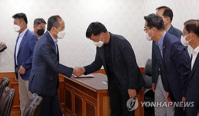 (서울=연합뉴스) 김인철 기자 = 추경호 경제부총리 겸 기획재정부 장관(왼쪽)이 15일 오후 서울 종로구 정부서울청사에서 열린 경제관계장관 간담회에 참석한 최상목 대통령비서실 경제수석과 인사하고 있다. 2022.5.15