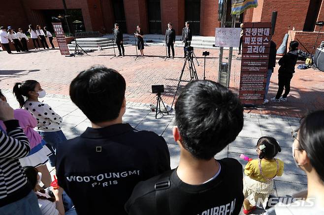 [서울=뉴시스] 백동현 기자 = 15일 오후 서울 종로구 아르코예술극장 앞마당에서 '전쟁반대 퍼포먼스 코리아' 공연이 펼쳐지고 있다. 이번 공연은 한국연출가협회 주관으로 이날부터 18일까지 4일간 'NO WAR! 전쟁반대를 위한 모든 퍼포먼스'를 주제로 펼쳐진다. 2022.05.15. livertrent@newsis.com