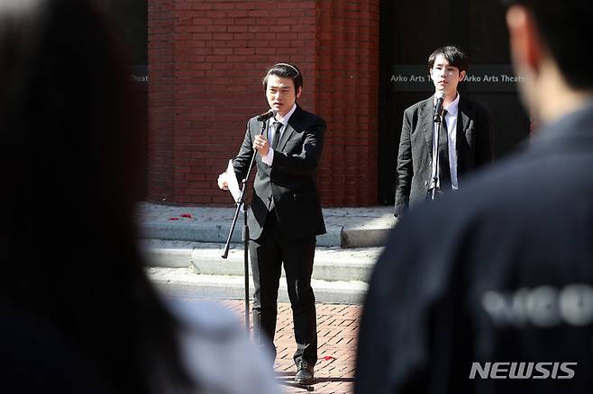 [서울=뉴시스] 백동현 기자 = 15일 오후 서울 종로구 아르코예술극장 앞마당에서 '전쟁반대 퍼포먼스 코리아' 공연이 펼쳐지고 있다. 이번 공연은 한국연출가협회 주관으로 이날부터 18일까지 4일간 'NO WAR! 전쟁반대를 위한 모든 퍼포먼스'를 주제로 펼쳐진다. 2022.05.15. livertrent@newsis.com