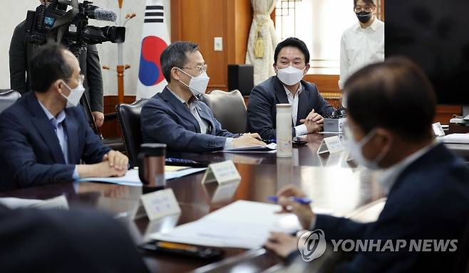 (서울=연합뉴스) 김인철 기자 = 원희룡 국토교통부 장관이 15일 오후 서울 종로구 정부서울청사에서 열린 경제관계장관 간담회에서 발언하고 있다. 2022.5.15