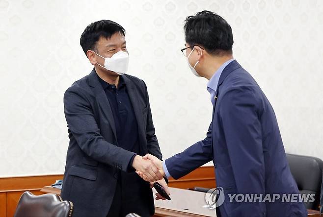 (서울=연합뉴스) 김인철 기자 = 최상목 대통령비서실 경제수석(왼쪽)과 정황근 농림축산식품부 장관이 15일 오후 서울 종로구 정부서울청사에서 열린 경제관계장관 간담회에서 인사하고 있다. 2022.5.15