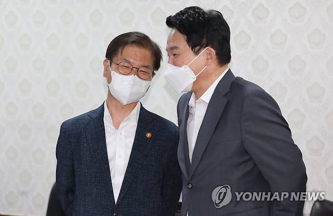 (서울=연합뉴스) 김인철 기자 = 이정식 고용노동부 장관(왼쪽)과 원희룡 국토교통부 장관이 15일 오후 서울 종로구 정부서울청사에서 열린 경제관계장관 간담회에서 대화하고 있다. 2022.5.15