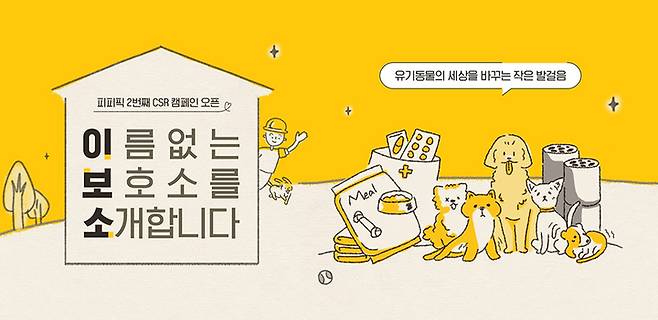 '이름 없는 보호소를 소개합니다' 캠페인은 2019년부터 서비스하고 있는 반려동물 간식 브랜드 '피피픽'이 낙후된 사설 보호소를 발굴해 실질적인 환경 개선을 지원하기 위한 목적으로 시작됐다. 캠페인 참여는 소비자가 피피픽 제품을 구매하면 해당 금액의 5%가 자동으로 후원 되는 형태다.