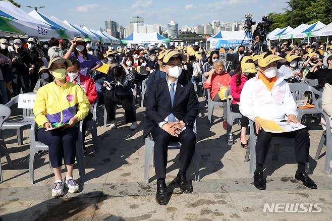 [서울=뉴시스] 김선웅 기자 = 오세훈 국민의힘 서울시장 후보와 송영길 더불어민주당 서울시장 후보, 권수정 정의당 서울시장 후보가 15일 오후 서울 여의도한강공원에서 열린 서울특별시학원연합회 2022 학교폭력예방 캠페인에 참석해 자리하고 있다. 2022.05.15. mangusta@newsis.com