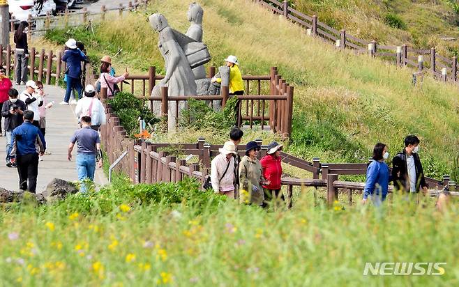 [서귀포=뉴시스] 우장호 기자 = 비교적 맑은 날씨를 보인 15일 오후 제주 서귀포시 대정읍을 찾은 관광객들이 송악산 둘레길을 걸으며 즐거운 시간을 보내고 있다. 2022.05.15. woo1223@newsis.com