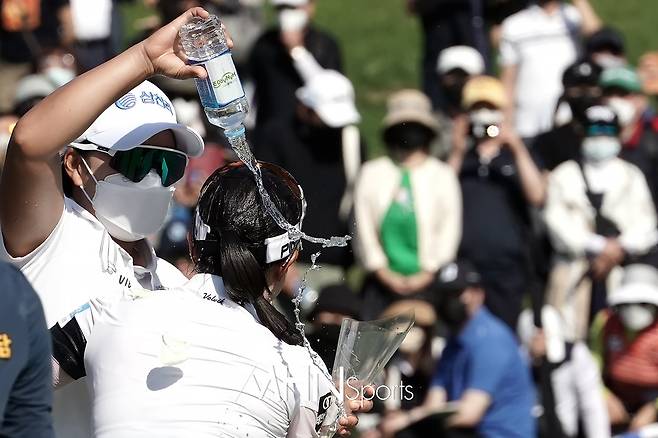 동료 선수들에게 물세례를 받고 있다.
