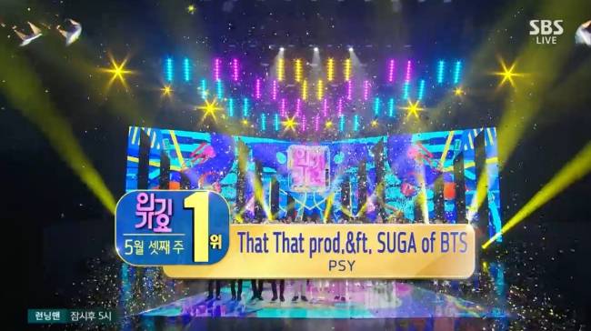 싸이는 15일 오후에 방송된 SBS ‘인기가요’에서 지난 달 29일 발표한 정규9집 ‘싸다9’의 타이틀곡 ‘댓 댓(That That)’으로 1위에 올랐다. 이날 방송에는 출연하지 않았다.