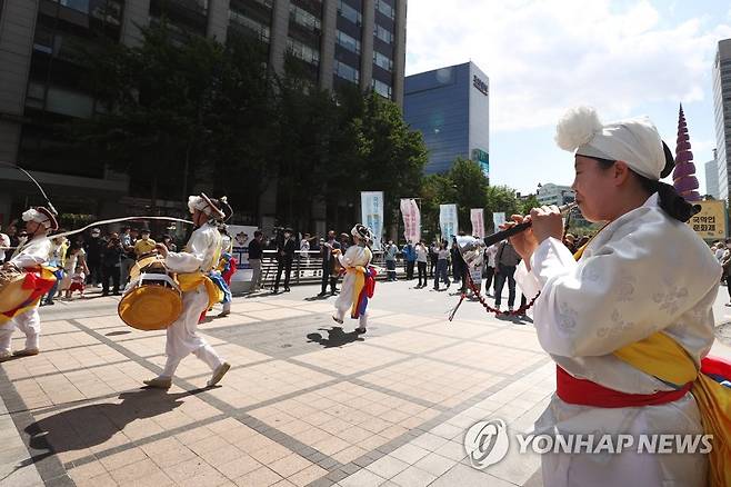 (서울=연합뉴스) 진연수 기자 = 15일 오후 서울 중구 청계광장에서 열린 국악교육의 미래를 위한 전 국악인 문화제에서 전통연희단 잔치마당이 길놀이를 하고 있다. 전국악인비상대책위원회와 한국국악교육연구학회는 교육부가 최근 공개한 '2022년 개정 음악과 교육과정 시안'에 내용 체계와 성취기준에서 국악이 삭제됐고, 필수가 아닌 '성취기준 해설'에 국악 교육이 통합돼 교육이 대폭 축소될 것이라며 개선을 요구하고 있다. 2022.5.15