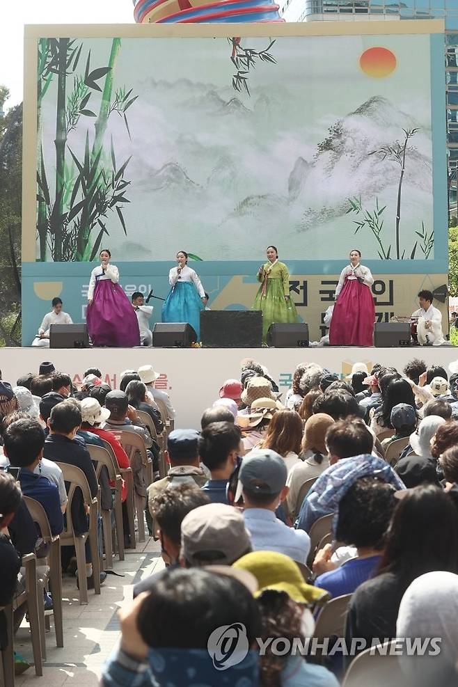 (서울=연합뉴스) 진연수 기자 = 15일 오후 서울 중구 청계광장에서 열린 국악교육의 미래를 위한 전 국악인 문화제에서 국악인들이 아리랑 연가 공연을 하고 있다. 전국악인비상대책위원회와 한국국악교육연구학회는 교육부가 최근 공개한 '2022년 개정 음악과 교육과정 시안'에 내용 체계와 성취기준에서 국악이 삭제됐고, 필수가 아닌 '성취기준 해설'에 국악 교육이 통합돼 교육이 대폭 축소될 것이라며 개선을 요구하고 있다. 2022.5.15