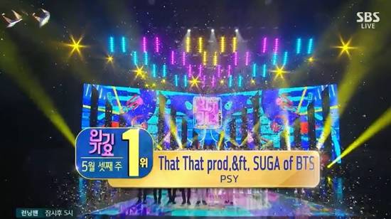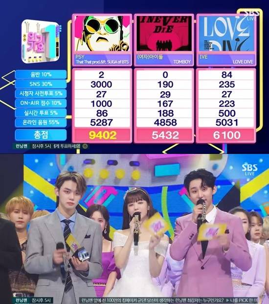 15일 방송된 SBS '인기가요'에서는 싸이의 'That That', (여자)아이들의 'TOMBOY', 아이브의 'LOVE DIVE'가 1위 후보에 이름을 올린 가운데, 싸이가 1위 트로피의 주인공이 됐다.