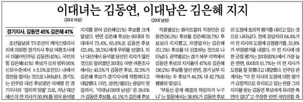 | ▲ 더불언민주당 김동연 후보와 국민의힘 김은혜 후보에 대한 20대 남성 지지율의 오차범위 내 격차에도 ‘이대남은 김은혜 지지’라고 제목 붙인 조선일보(5/3) |