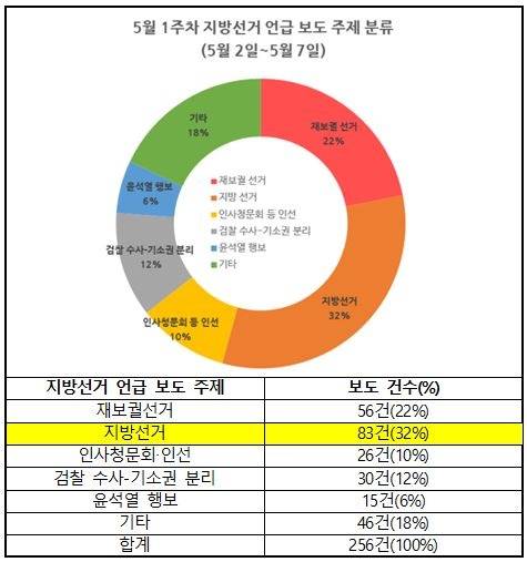 | ▲ 5월 1주차 지방선거가 언급된 신문보도 주제 분석 및 보도건수(5/2~7) |