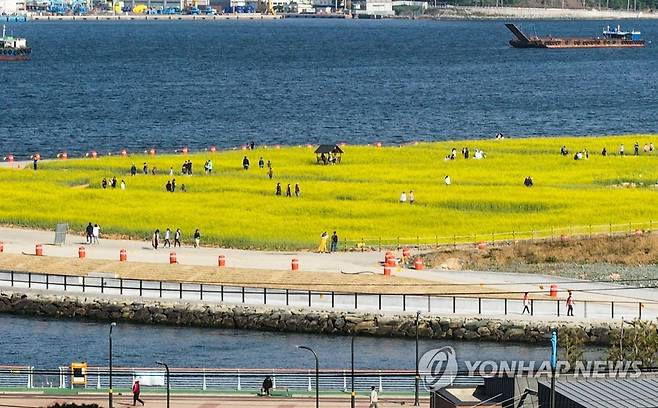 (창원=연합뉴스) 김동민 기자 = 일요일인 15일 오후 경남 창원시 마산합포구 마산해양신도시에 조성된 유채·청보리밭에서 시민이 휴식을 취하고 있다.