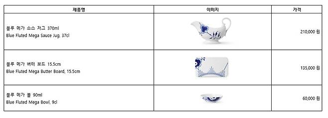 먼저 '소스 저그'는 로얄코펜하겐의 아카이브에서 복원한 제품으로 잘록하게 올라온 굽, 긴 주둥이, 우아하고 둥근 손잡이 등 고전적인 형태가 그대로 살아있다. 여기에 블루 메가의 현대적인 패턴이 가미돼 시대를 초월한 아름다움을 느낄 수 있다.